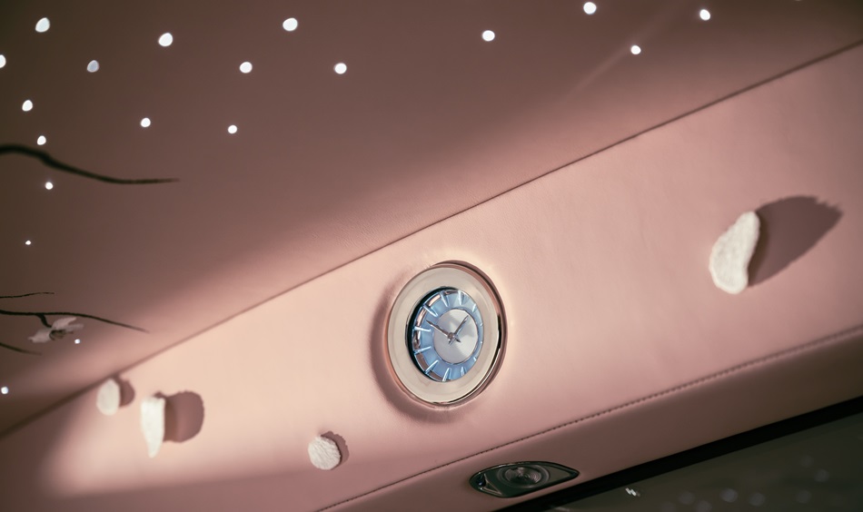 Aracın iç kısmında, müşterinin hayal ettiği gibi, Hanami sırasında çiçek açan bir ağacın altında oturmanın verdiği hissiyatı, ince işçilikle işlenmiş nakışlar yansıtıyor. Bespoke (özel tasarım) Starlight tavan döşemesi, zarif beyaz çiçeklerle serpilmiş nakışlı bir kiraz dalıyla süslendi. Düşen yaprak işlemeleri, arka kapı panelleri ve ön ve arka yolcu bölmeleri arasındaki ‘Privacy Suite’ bölmesinde yer alıyor. Çağdaş el sanatlarının bu olağanüstü ifadesinin tasarımı ve geliştirilmesi altı aydan uzun sürerken, sadece tavan döşemesi üç hafta sürdü ve 250.000’den fazla dikiş atıldı.