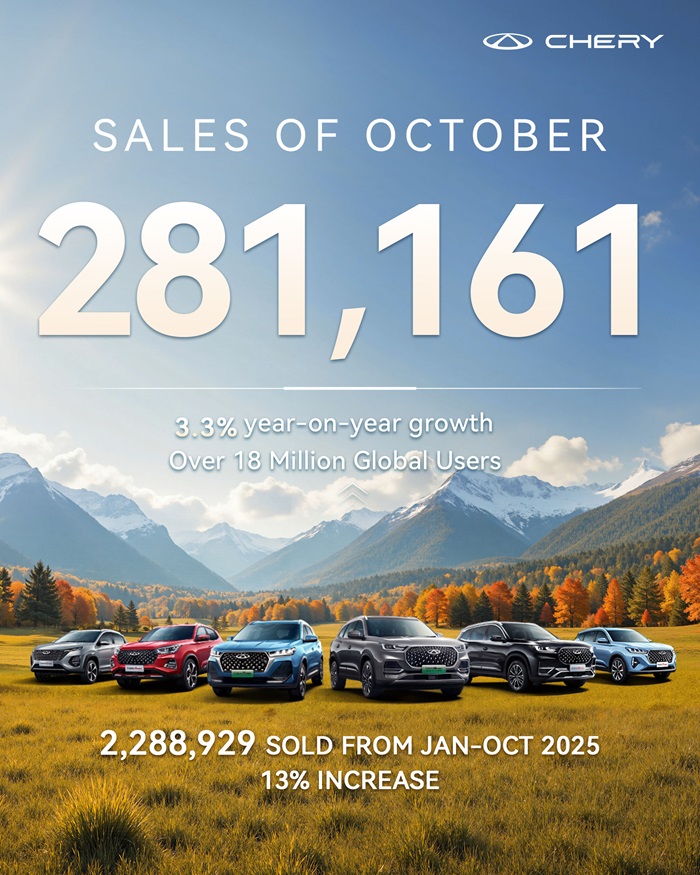 Çin’in otomotiv alanındaki ihracat lideri Chery Grubu, ekim ayında 281 bin 161 adetlik satışa ulaştı. Bu rakamın 110 bin 346 adedini NEV satışları oluştururken, Chery Grubu ihracatını da 126 bin adedin üzerine çıkararak art arda 6 aydır 100 bin adedin üzerinde ihracat rakamına ulaşmayı başardı. Chery Grubu, ocak–ekim döneminde ise toplamda 2 milyon 288 bin 929 adet araç satarak geçen yılın aynı dönemine göre yüzde 13 büyüme kaydetti ve bu döneme ait satış rekorunu kırdı. Markanın küresel kullanıcı sayısı artık 18 milyonu aşarken, bunların 5,56 milyonu yurtdışında bulunuyor.