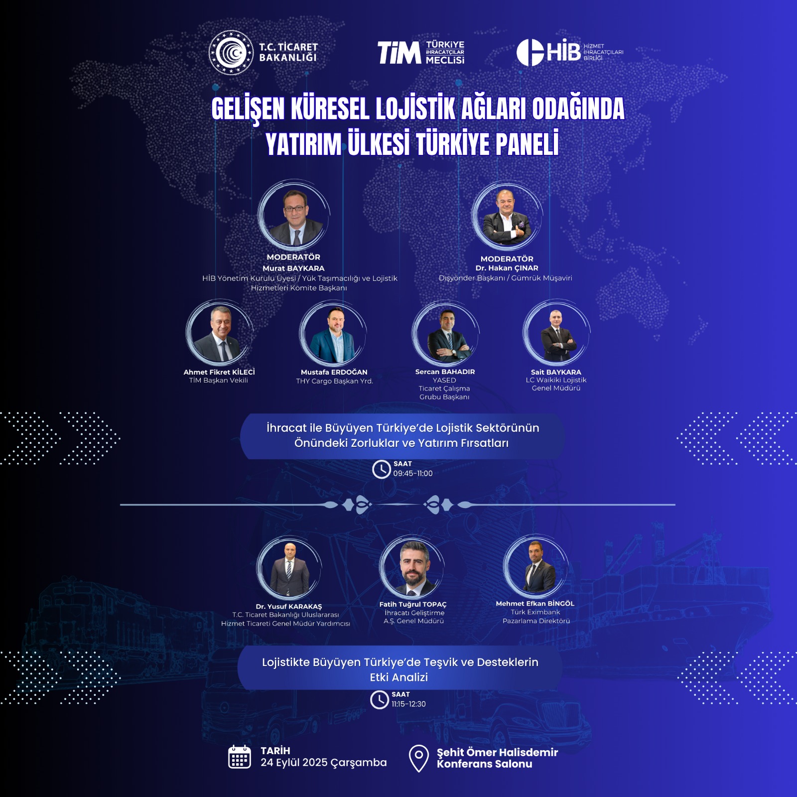 Ticaret Bakanlığı, Türkiye İhracatçılar Meclisi (TİM) ve Hizmet İhracatçıları Birliği (HİB) iş birliğiyle, lojistik sektörünün yatırım ve büyüme potansiyelini , Taşımacılık ve Lojistik sektörüne verilen devlet desteklerini ve kredi olanaklarını mercek altına alan önemli bir etkinlik düzenleniyor. “Gelişen Küresel Lojistik Ağları Odağında Yatırım Ülkesi Türkiye Paneli”, 24 Eylül 2025 Çarşamba günü, sektör temsilcilerinin ve kamu kurumlarının katılımıyla TİM Şehit Ömer Halisdemir Konferans Salonu’nda gerçekleştirilecek.