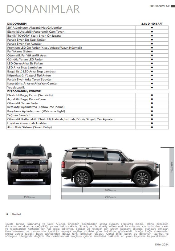 Toyota, yeni Land Cruiser Prado modelini Türkiye’de en üst donanım seviyesiyle ve 7 koltuklu konfigürasyonla satışa sundu. Yeni nesil Land Cruiser Prado büyüyen boyutlarıyla tüm koltuklarında daha fazla konfor sunarken, premium ve gelişmiş donanımları kullanıcılarıyla buluşturuyor.