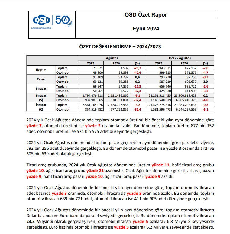 Türkiye otomotiv sanayisine yön veren 13 üyesiyle sektörün çatı kuruluşu konumunda olan Otomotiv Sanayii Derneği (OSD), 2024 yılının ocak-ağustos dönemine ait üretim ve ihracat adetleri ile pazar verilerini açıkladı. Buna göre, yılın ilk 8 aylık döneminde toplam otomotiv üretimi bir önceki yılın aynı dönemine göre yüzde 7 azalarak 877 bin 152 adede ulaştı. Otomobil üretimi ise yüzde 7 azalarak 571 bin 575 adet olarak gerçekleşti. Traktör üretimiyle birlikte toplam üretim ise 909 bin 292 adedi buldu. Yılın ilk sekiz aylık döneminde ticari araç grubunda üretim bir önceki yılın aynı dönemine göre yüzde 11, ağır ticari araç grubunda yüzde 21, hafif ticari araç grubunda ise yüzde 10 geriledi. Bu dönemde, otomotiv sanayisinin kapasite kullanım oranı yüzde 68 olarak gerçekleşti. Araç grubu bazında kapasite kullanım oranları ise hafif araçlarda (otomobil + hafif ticari araç) yüzde 68, kamyon grubunda yüzde 73, otobüs-midibüs grubunda yüzde 52 ve traktörde yüzde 64 seviyesinde gerçekleşti.