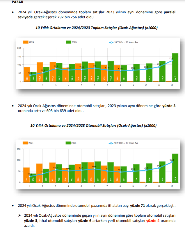 Toplam pazar 800 bin adede yaklaştı! 2024’ün ilk 8 aylık döneminde toplam pazar, bir önceki yılın aynı dönemine paralel seviyede gerçekleşerek ve 792 bin 256 adet oldu. Bu dönemde, otomobil pazarı da yüzde 3 arttı ve 605 bin 639 adet oldu. Ticari araç pazarına bakıldığında ise yılın ilk 8 ayında, bir önceki yılın aynı dönemine kıyasla toplam ticari araç pazarı ve ağır ticari araç pazarı yüzde 9 gerilerken, hafif ticari araç pazarındaki düşüş yüzde 10 olarak kayıtlara geçti. 2024 yılı ocak-ağustos döneminde otomobil satışlarındaki yerli araç payı yüzde 29, hafif ticari araç pazarında yerli araç payı ise yüzde 30 olarak gerçekleşti.