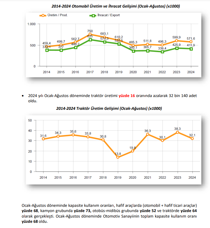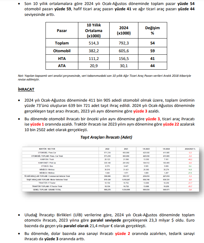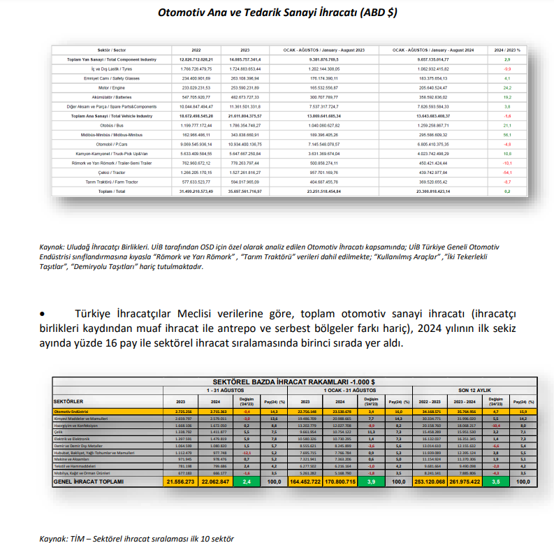 Yılın ilk sekiz aylık döneminde otomotiv ihracatı geçtiğimiz yılın aynı dönemine göre adet bazında yüzde 3 gerileyerek 639 bin 721 adet olarak gerçekleşti. Bu dönemde otomobil ihracatı da bir önceki yılın aynı dönemine göre yüzde 3 azalırken, ticari araç ihracatı ise yüzde 1 oranında geriledi. Traktör ihracatı ise 2023 yılının aynı dönemine göre yüzde 22 azalarak 10 bin 250 adet olarak gerçekleşti. Türkiye İhracatçılar Meclisi verilerine göre, ihracatçı birlikleri kaydından muaf ihracat ile antrepo ve serbest bölgeler farkı hariç toplam otomotiv sanayi ihracatı, 2024’ün ilk sekiz aylık döneminde yüzde 16 ile sektörel ihracat sıralamasında ilk sıradaki yerini korudu. Uludağ İhracatçı Birlikleri (UİB) verilerine göre, ilk 8 aylık dönemde toplam otomotiv ihracatı, 2023 yılının aynı dönemiyle paralel seyretti ve 23,3 milyar dolar olarak gerçekleşti. Euro bazında ise ihracat paralel seyrederek 21,4 milyar euro olarak gerçekleşti. Bu dönemde, dolar bazında ana sanayi ihracatı yüzde 2 oranında azalırken tedarik sanayi ihracatı da yüzde 3 arttı.